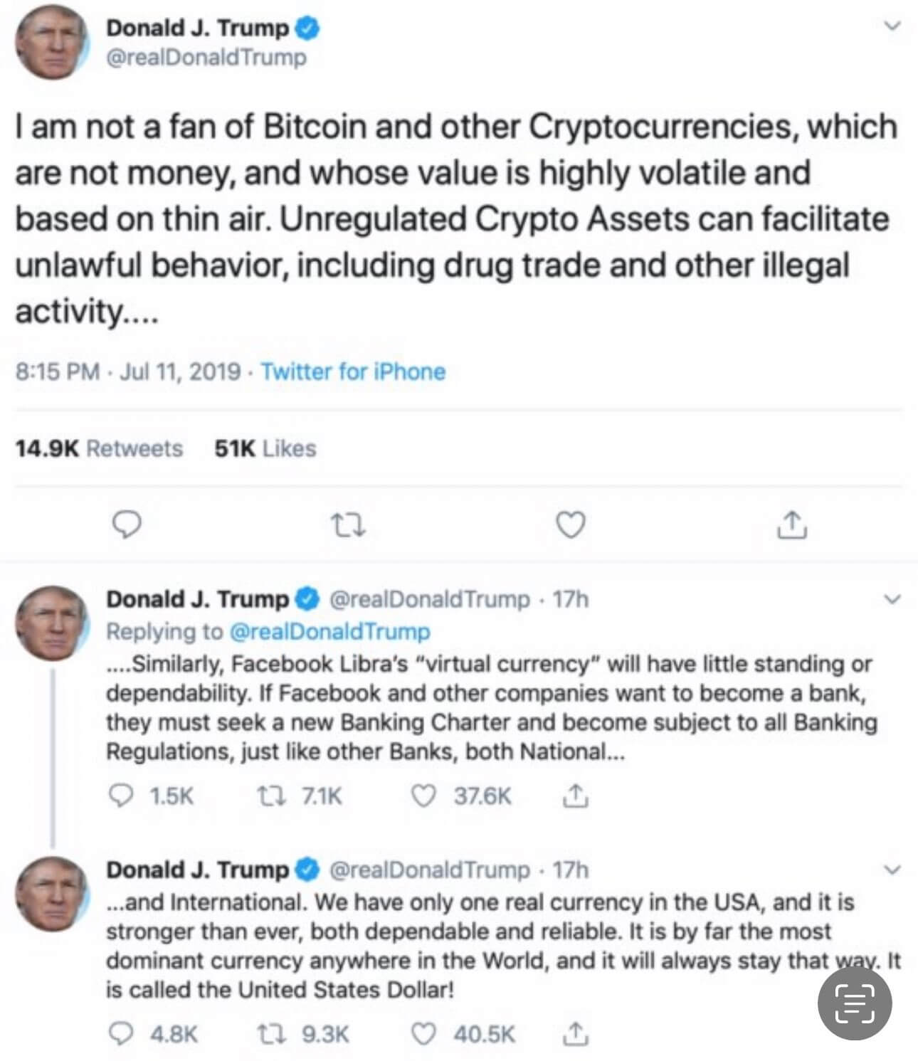 Твиты Трампа за 2019 год, в которых он называет крипту «пустышкой»