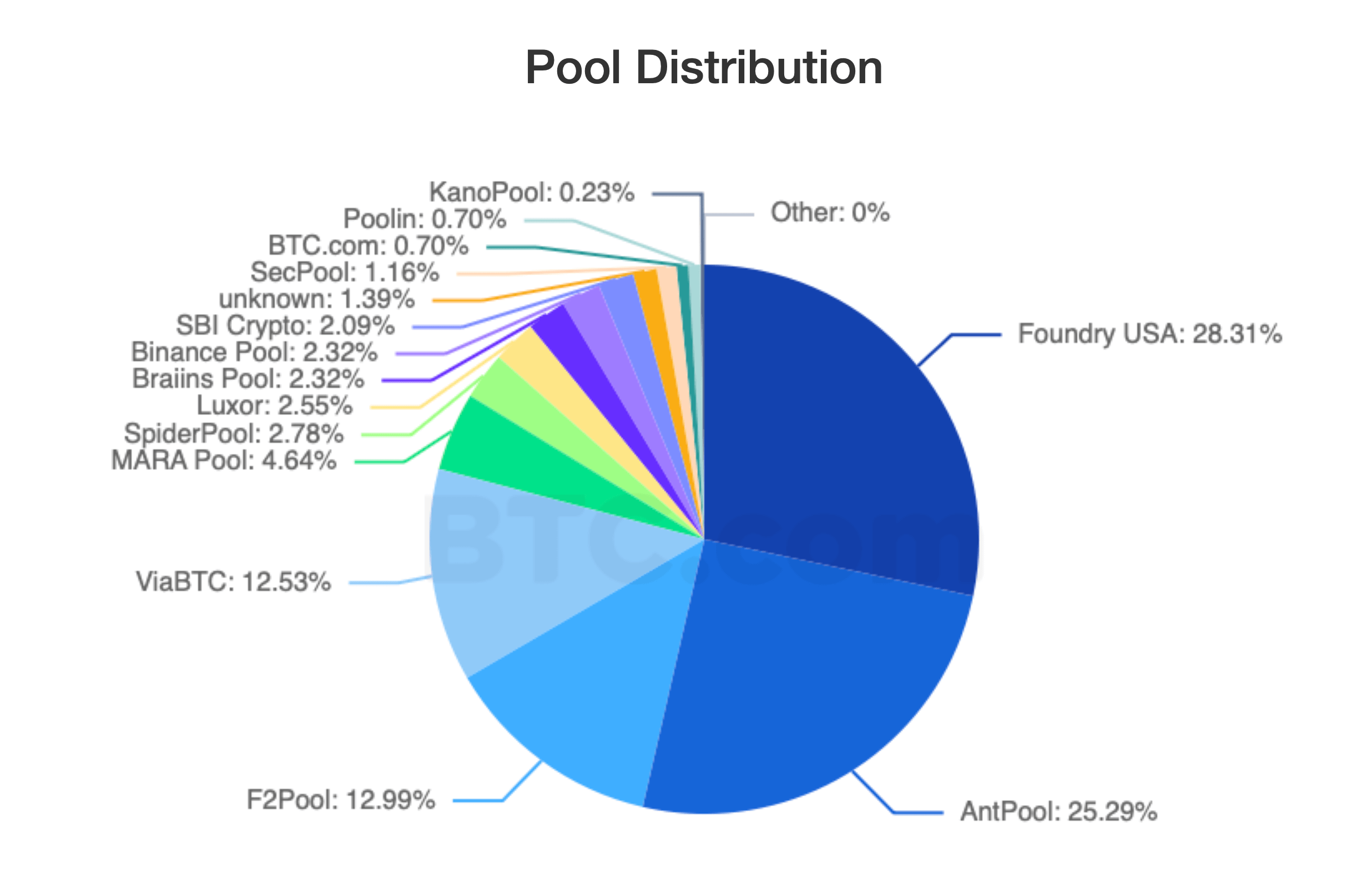 Однако по состоянию на сегодня крупнейший майнинг-пул по добыче BTC действительно находится в Америке. Речь идёт о платформе Foundry USA, на которую сегодня приходится около 28 процентов от общего хешрейта сети Биткоина. Вот соответствующий график.