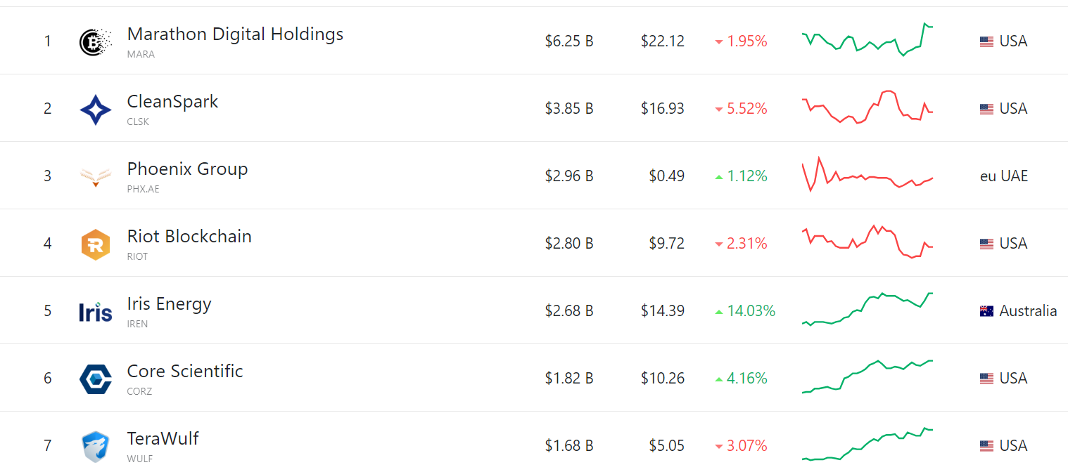 Marathon, оцениваемая в более чем 6,25 миллиарда долларов, является крупнейшей в мире компанией по добыче биткоинов, превосходящей вторую по величине компанию CleanSpark на 62%. По данным CompaniesMarketCap, рыночная капитализация CleanSpark составляет $3,85 млрд.