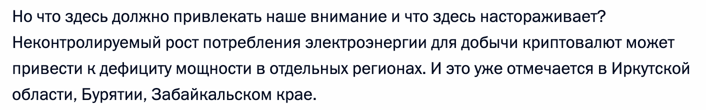 А тем временем в Иркутской области, Бурятии и Забайкальском крае уже начались перебои с электричеством. То ли майнеры виноваты, то ли просто провода прогнили — кто знает? Но Путин уверен: без «своевременных и системных решений на уровне федерального закона» страну ждет энергетический коллапс.