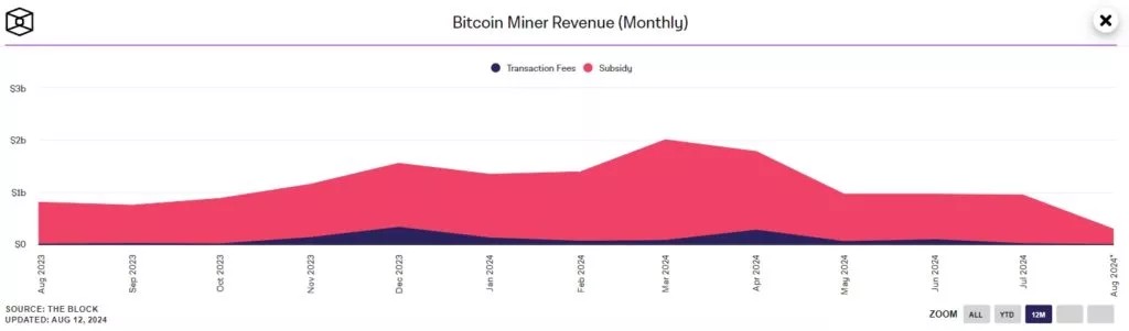 Однако в последующие месяцы транзакционные доходы майнеров значительно сократились, достигнув $24,9 млн по итогам июля против полученных $926,2 млн в качестве субсидий за добытый блок.