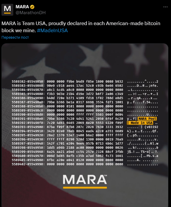 Каждый блок, добытый MARA Pool, с гордостью отмечен знаком «Сделано в США». Мы — единственная крупная майнинг-компания, которая может это делать, потому что мы управляем собственным пулом и гарантируем, что все добытые блоки произведены в США, — заявил CEO Marathon Digital Фред Тиль.