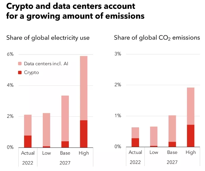 Шафик Хебус из Департамента фискальных вопросов и экономист отдела политики в области климата Нейт Вернон-Лин отметили, что добыча криптовалют и дата-центры к 2025 году будут обеспечивать до 3,5% глобального энергопотребления. Это эквивалентно текущему показателю Японии — пятому по величине потребителю в мире.