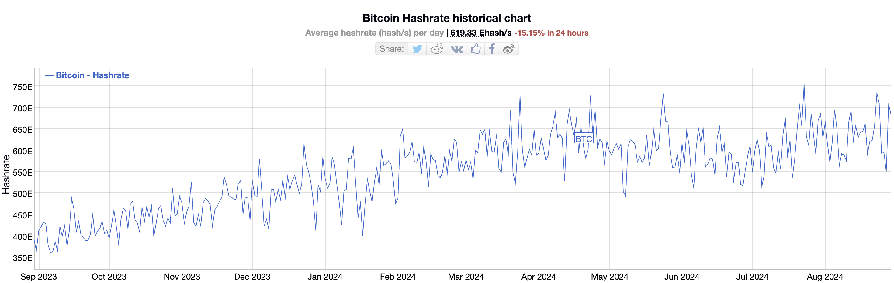 В данном случае майнер использовал хешрейт в 456 PH/s. Это составляет всего 0,012% от среднего хешрейта сети Биткоин, который в настоящее время оценивается в 684 EH/s, согласно BitInfoCharts.
