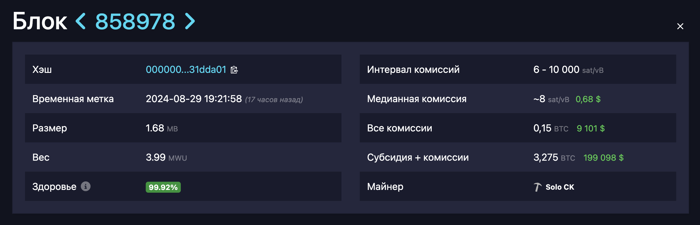 Майнер-одиночка включил блок #858 978 в сеть Биткоина и получил за это в качестве субсидий и комиссий 3,275 BTC (около $200 тыс.)