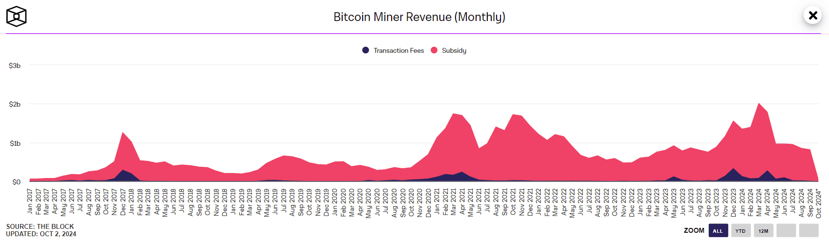 В сентябре 2024 года месячный доход майнеров составил $815,7 млн, согласно данным дашборда The Block. Это новый минимум от сентября 2023 года, когда показатель опустился до $753,6 млн.