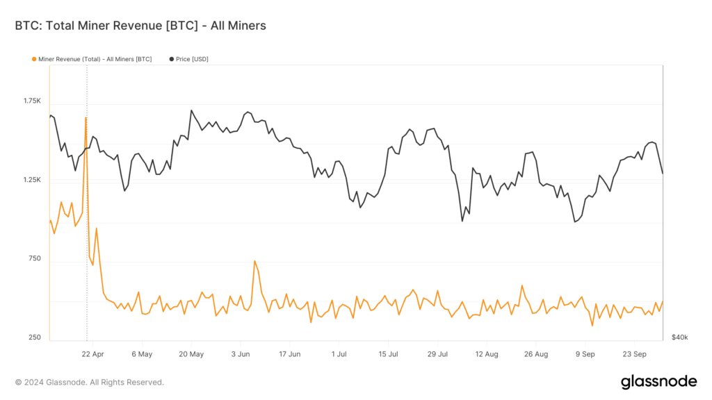 Это подтверждают и данные Glassnode. Если до халвинга суточный доход майнеров превышал 1000 BTC, то в сентябре он упал ниже уровня в 470 BTC.