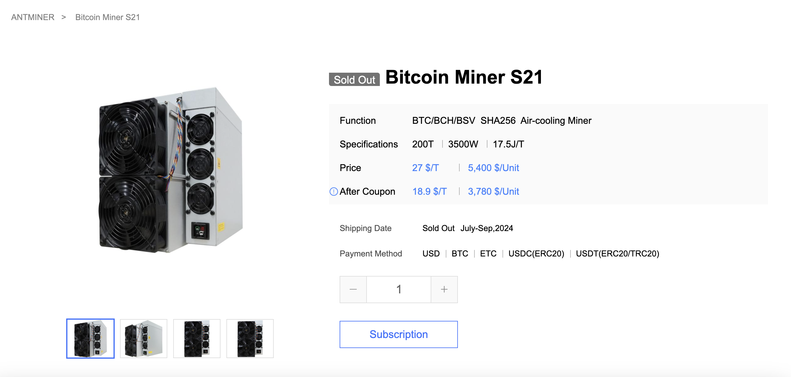 На сайте производителя майнинг-оборудования Bitmain устройство Antminer S21 стоит $5 400. С учетом скидки приобрести его можно было за $3 780. Однако все девайсы уже раскуплены.