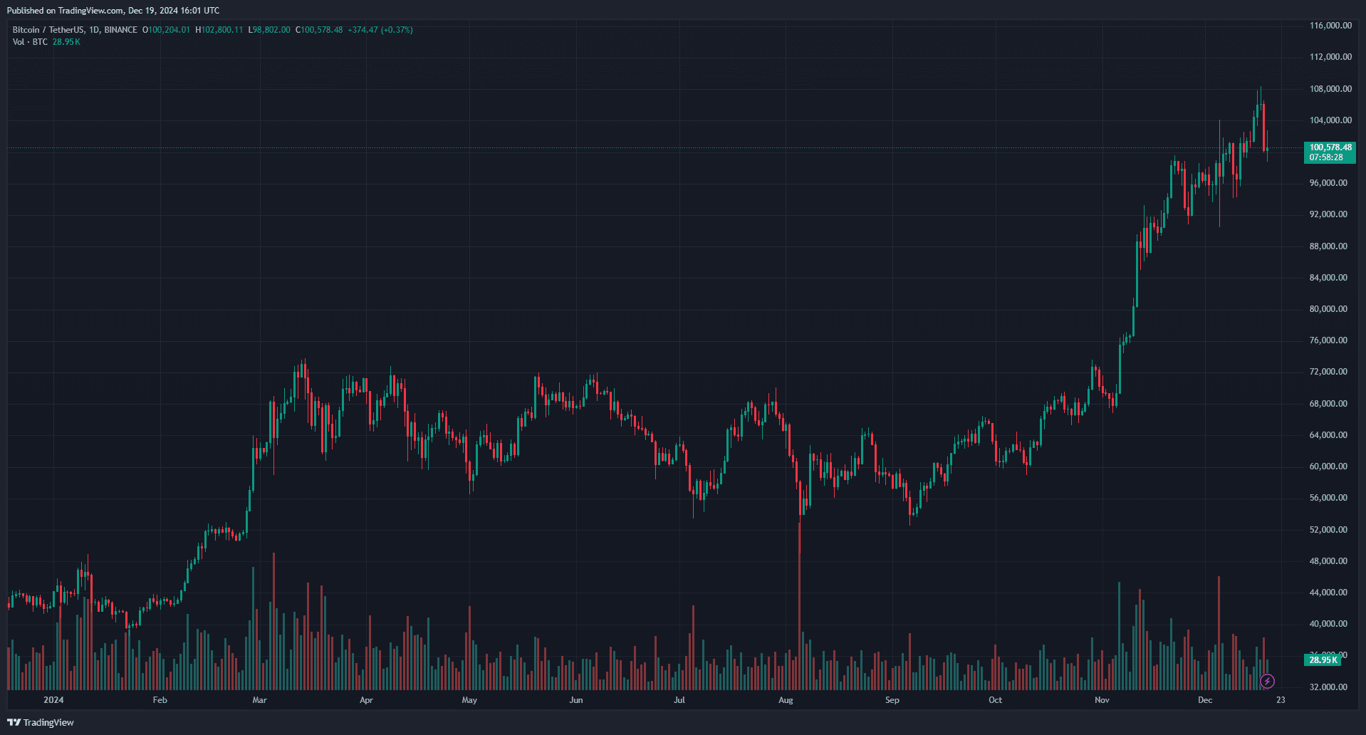 16 декабря 2024 года первая криптовалюта обновила исторический максимум на отметке выше $108 000. Хотя в дальнейшем биткоин столкнулся с ощутимой коррекцией и 19 декабря цена актива опустилась ниже $99 000, однако годовой прирост все еще держится на уровне 137,8%, по данным TradingView.