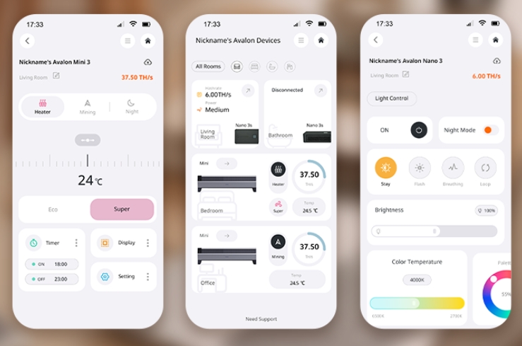 Каждый Avalon Mini 3 и Nano 3S поставляется с Wi-Fi-приемником от стороннего производителя. Оба ASIC-майнера управляются с мобильного приложения Avalon Family, через которое можно настроить параметры майнинга, а также режим обогрева.