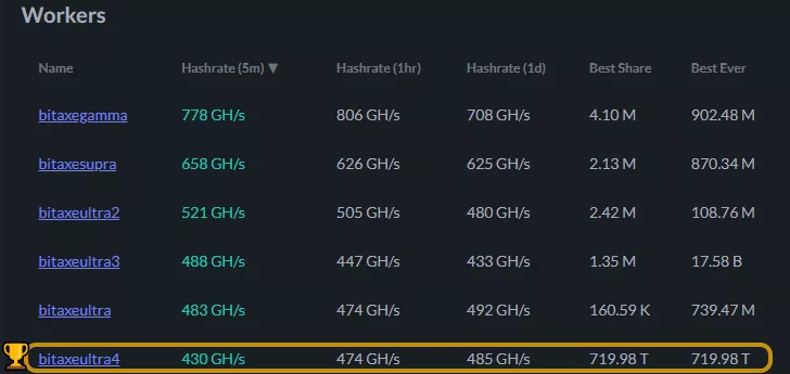 Всего пользователь задействовал в майнинге шесть Bitax производства компании D-Central Technologies с совокупных хешрейтом ~3,3 TH/s. «Победителем» оказалась одна из установок модели Ultra. В ней используется ASIC-чип для Antminer S19XP от Bitmain.