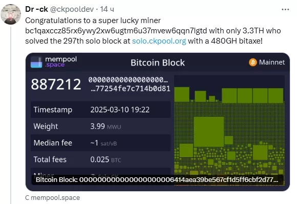 10 марта майнер-одиночка добыл блок #887 212 в сети первой криптовалюты с помощью домашней установки Bitax с хешрейтом 480 GH/s. Его вознаграждение составило 3,15 BTC или ~$250 000.