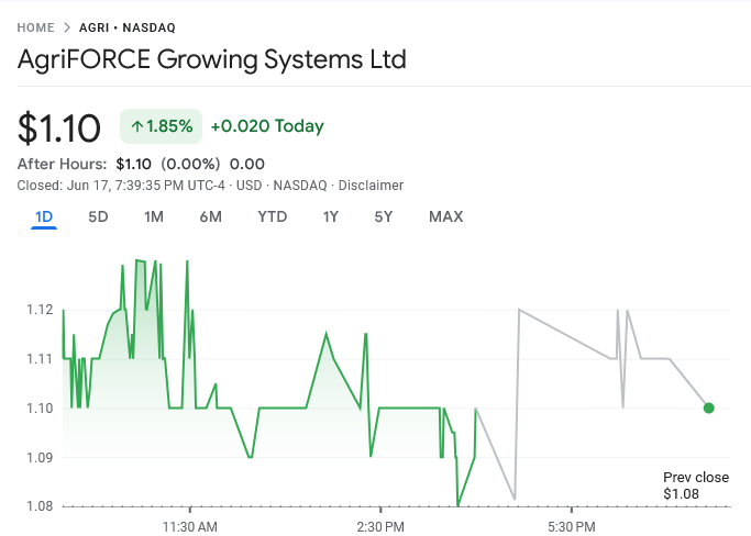 Акции AgriFORCE, упавшие более чем на 53% с начала года, выросли на 1,85% во вторник и завершили торговую сессию на уровне $1,10.