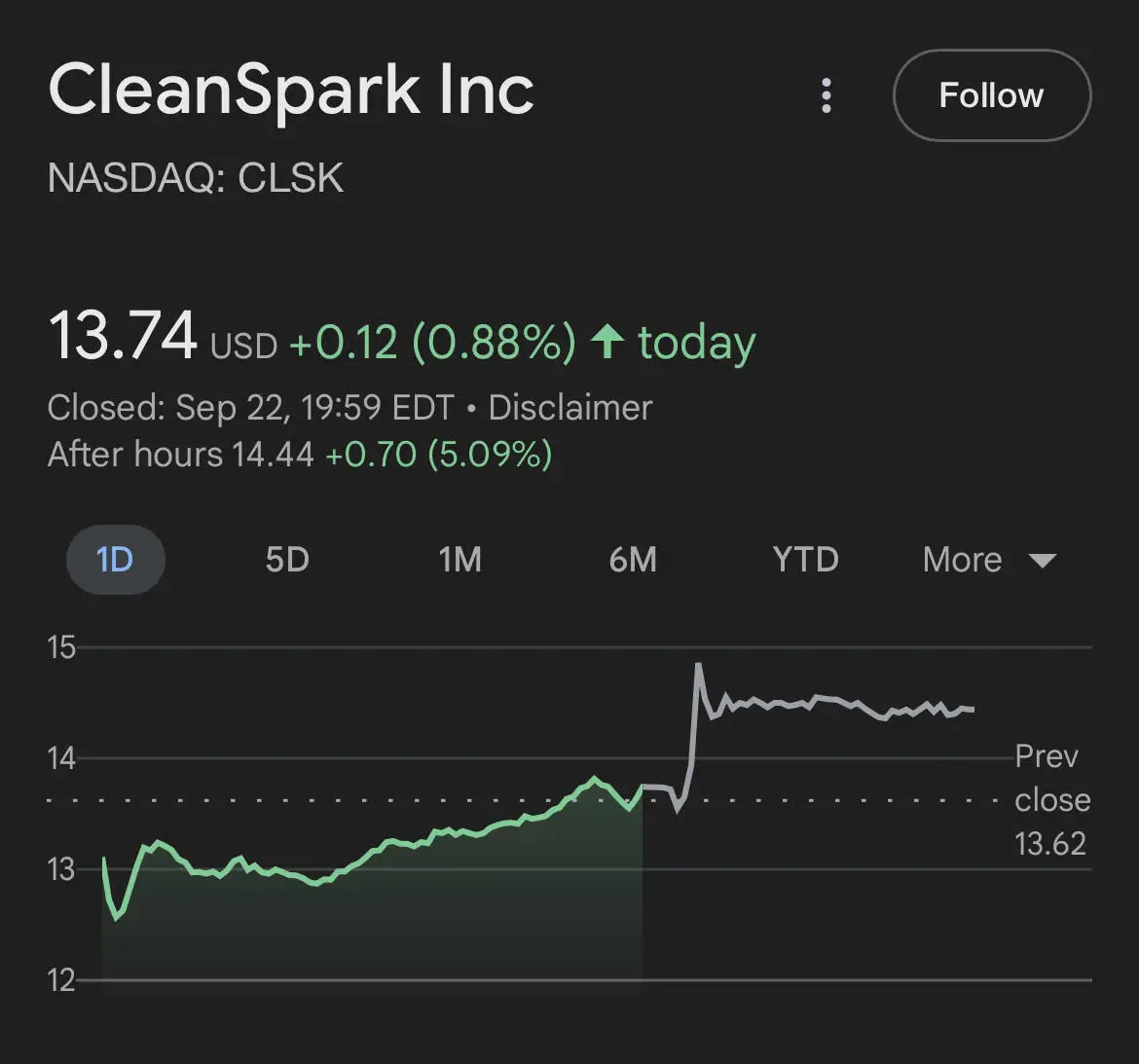 Акции CleanSpark (CLSK) закрылись 22 сентября на отметке $13,74. После объявления цена выросла примерно на 5%, достигнув $14,44 после закрытия торгов.