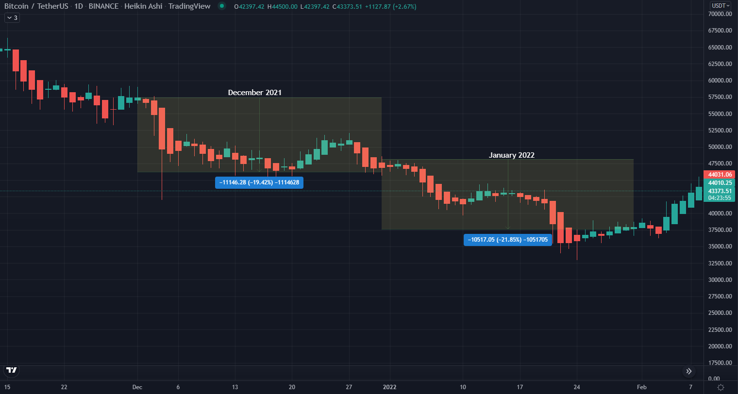 В феврале мы сможем наблюдать более впечатляющие показатели, поскольку обе криптовалюты демонстрируют отскок от январских минимумов. Биткоин уже вырос на 15% в феврале и вернулся на уровень $44 000, а эфир в настоящее время удерживает поддержку выше отметки в $3100.