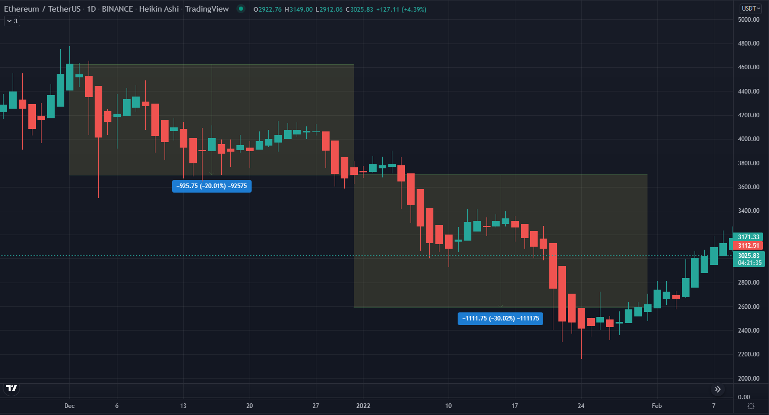 К концу января 2022 года цены на BTC и ETH снизились на 44% и 45% соответственно, по сравнению с их историческими максимумами, установленными в ноябре 2021 года.