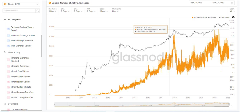 Несмотря на снижение доходов от майнинга BTC, количество активных адресов в январе 2022 года преодолело психологически значимую отметку в 1 млн.