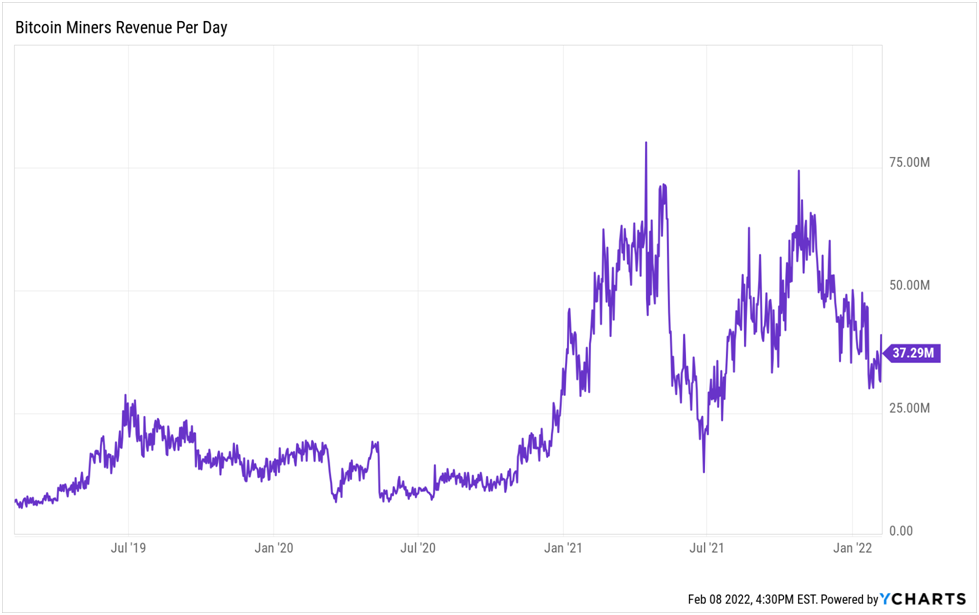 Доход майнера можно рассчитать, взяв количество заработанных монет по торговой цене монеты за определенный период. Это объясняет, почему в январе 2022 года произошло снижение выручки от майнинга.