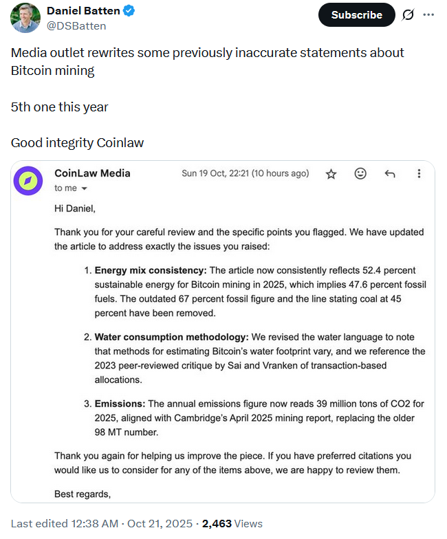 Рисунок 2. Некоторые из недавних высказываний Баттена против криптовалютного экологического FUD. Источник: Daniel Batten