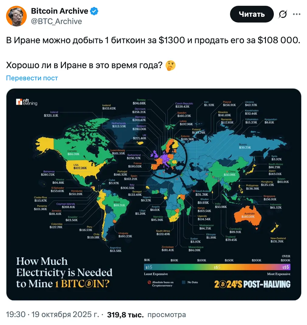 Низкая стоимость майнинга биткоина в Иране. Источник: Bitcoin Archive