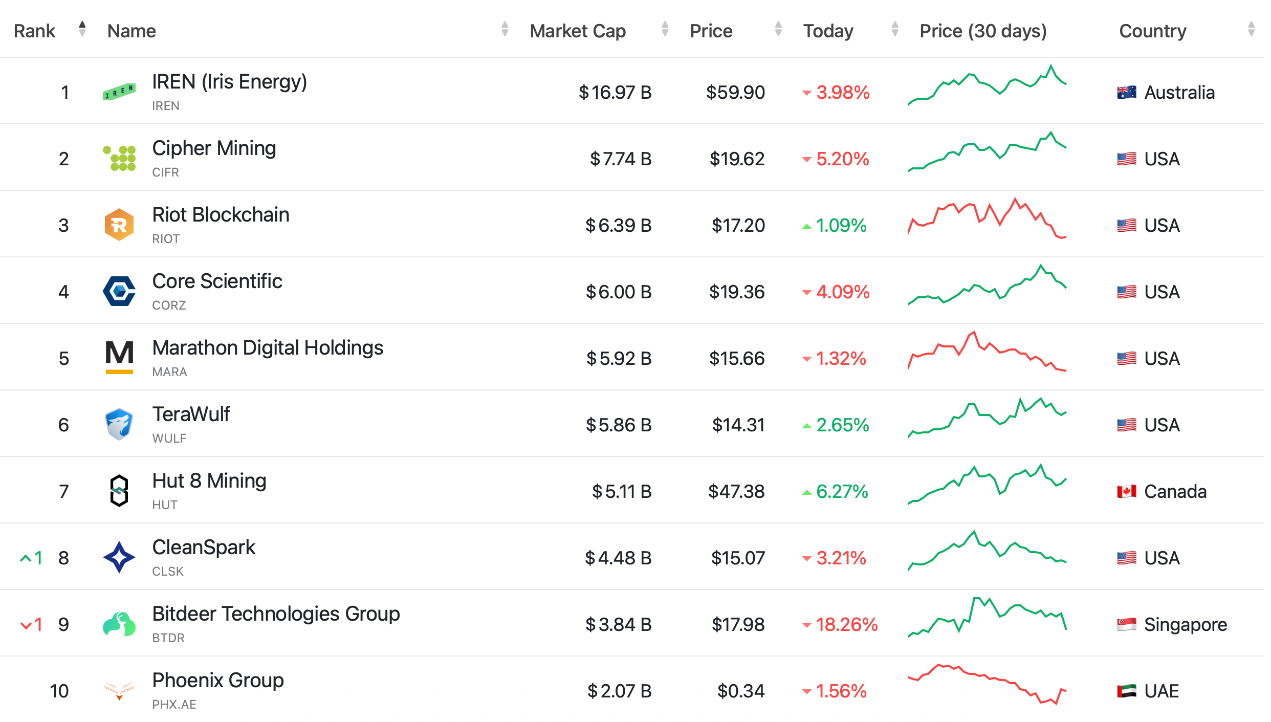 Рисунок 2. 10 крупнейших публичных майнеров биткоинов по рыночной капитализации. Источник: Companiesmarketcap.com.