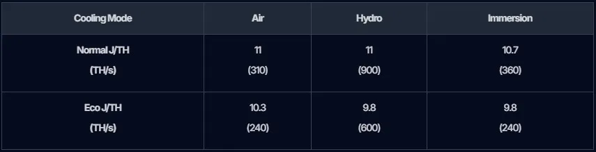 Система с жидкостным отводом тепла обеспечивает 600 TH/s и 9,8 J/TH. Вариант в погружном исполнении выдает 240 TH/s при аналогичном коэффициенте энергозатрат.