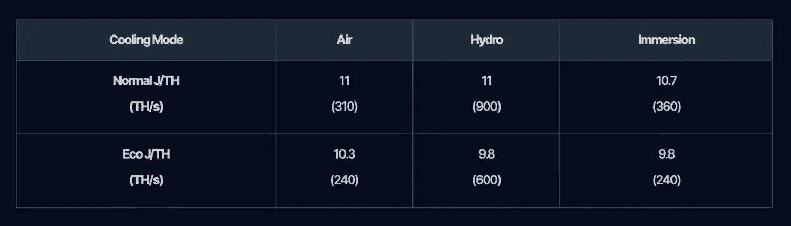 В заявлении Auradine указано, что майнеры спроектированы и собраны в США. Устройства будут доступны в версиях с воздушным, гидравлическим и иммерсионным охлаждением. Показатели энергоэффективности варьируются от 11 J/TH в стандартном режиме с воздушным охлаждением до 9,8 J/TH в эко-режимах с гидравлическим и иммерсионным охлаждением.