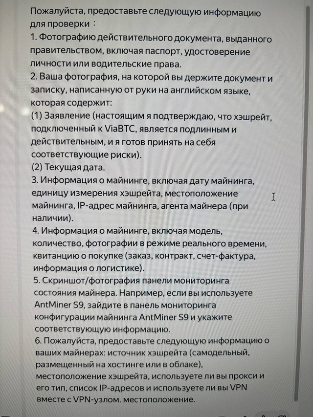 Представители ViaBTC стали запрашивать документы из определенного перечня. Требование распространилось в том числе на клиентов, которые используют сервис на протяжении многих лет.