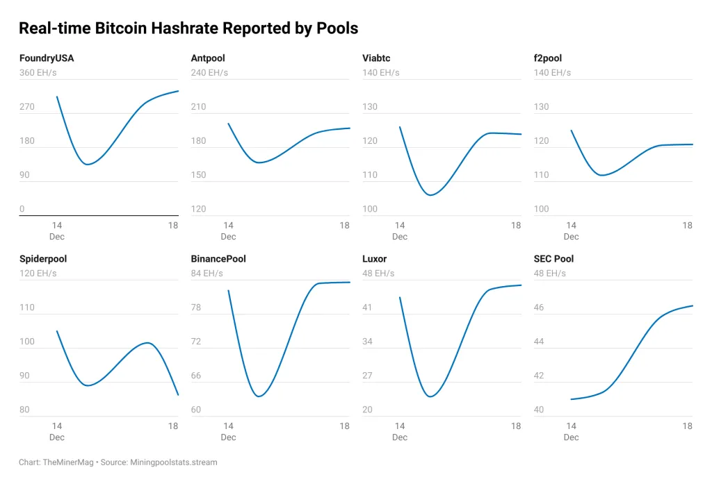 Исключением стал SpiderPool, чей хешрейт к 18 декабря оставался ниже на ~20 EH/s. В TheMinerMag считают, что это косвенно подтверждает реальные, но все же ограниченные по масштабу отключения.