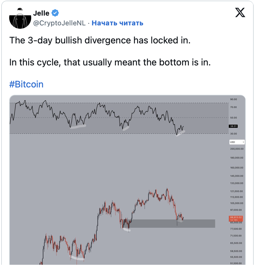 Технические индикаторы подтверждают вероятность завершения коррекции. Аналитики зафиксировали формирование фигуры «бычья дивергенция» на трехдневном графике. Ранее появление подобного паттерна дважды предваряло формирование ценового дна и начало нового восходящего тренда. На данный момент биткоин торгуется в районе $88 066, продолжая испытывать умеренное давление со стороны продавцов.