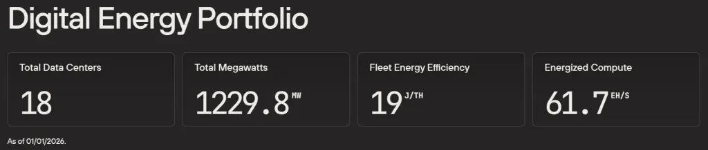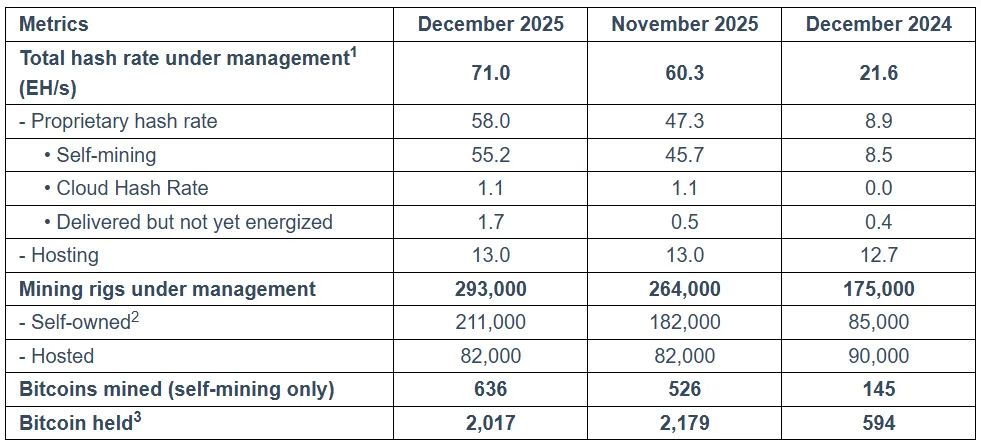 Bitdeer reported 71 EH/s capacity as of end December (~6% of global hash rate), +18% m/m, +229% y/y.
