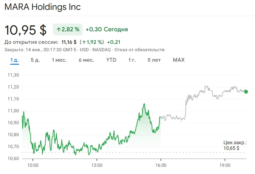 Бумаги MARA поднялись на 2%, достигнув отметки $10,93.