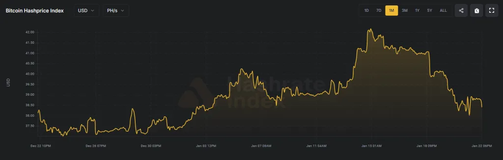 По данным Hashrate Index, хешпрайс находится на отметке $38,4 за PH/s в сутки. Примерно в середине января доход майнеров в пересчете на затраченную вычислительную мощность достигал $42.