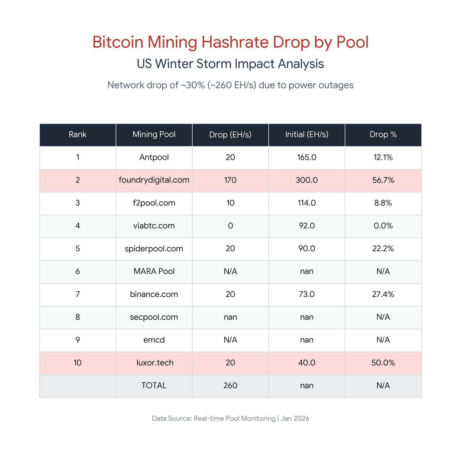 «Из-за экстремальных зимних штормов в США несколько майнинговых ферм по всей стране столкнулись с отключениями электроэнергии. Совокупный хешрейт биткоина за короткий период снизился примерно на 30%, что соответствует падению примерно на 260 EH/s», — подчеркнул эксперт.