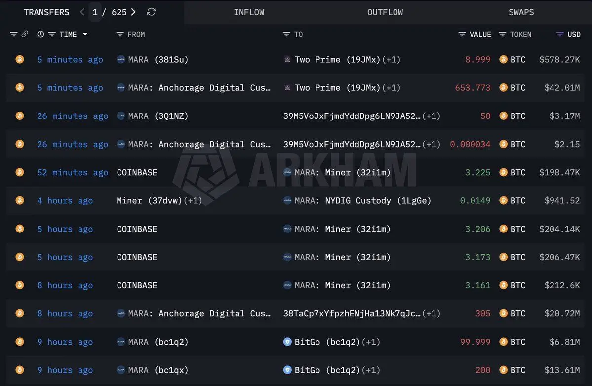 Майнер MARA за последние 10 часов переместил 1 318 $BTC на сумму около $86,89 млн различным получателям — контрагентам и площадкам для хранения, о чем свидетельствуют данные Arkham.