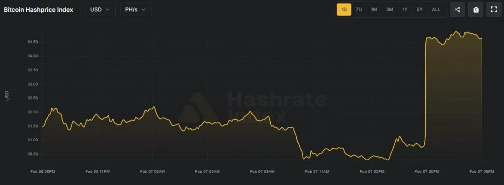 По данным Hashrate Index, за последние 24 часа хешпрайс вырос с примерно $31,5 за PH/s в сутки до $34,8.