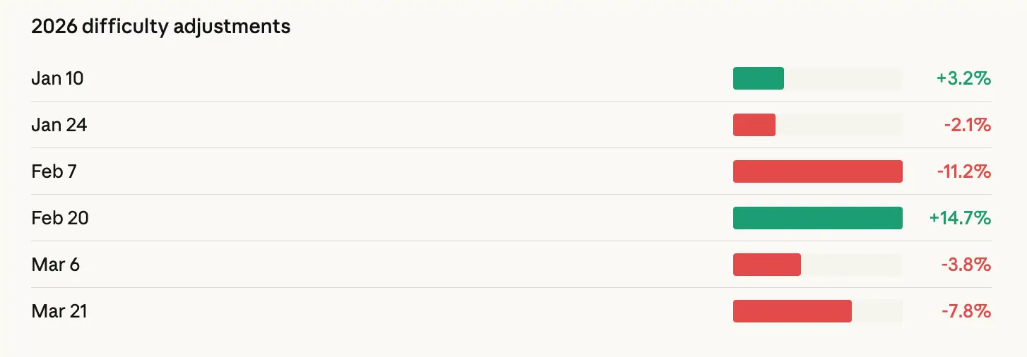 Сеть уже демонстрирует признаки напряжения. В субботу сложность добычи упала на 7,76% до 133,79 трлн — это вторая по величине отрицательная корректировка в 2026 году после падения на 11,16% в феврале во время зимнего шторма «Ферн». Сейчас сложность почти на 10% ниже уровня начала года и значительно ниже исторического максимума ноября 2025 года, близкого к 155 трлн.