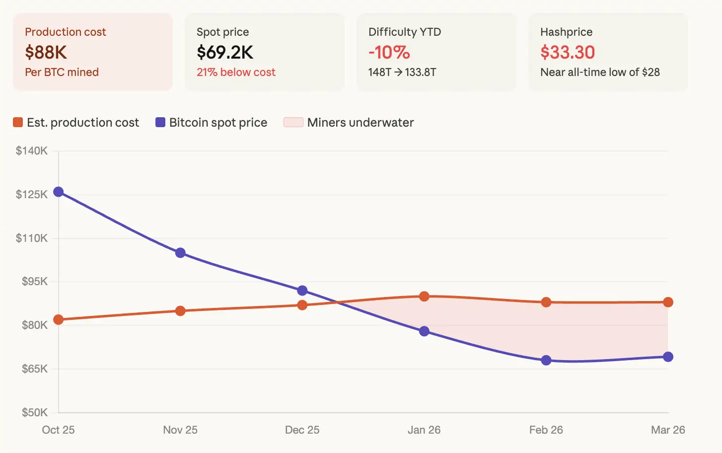 По данным регрессионной модели Checkonchain на 13 марта, средняя себестоимость добычи составляет $88 000 за биткоин. Утром в воскресенье биткоин торговался по цене $69 200 — это создает разрыв почти в $19 000 на каждую монету. В результате средний майнер работает с убытком в 21% на каждом добытом блоке.