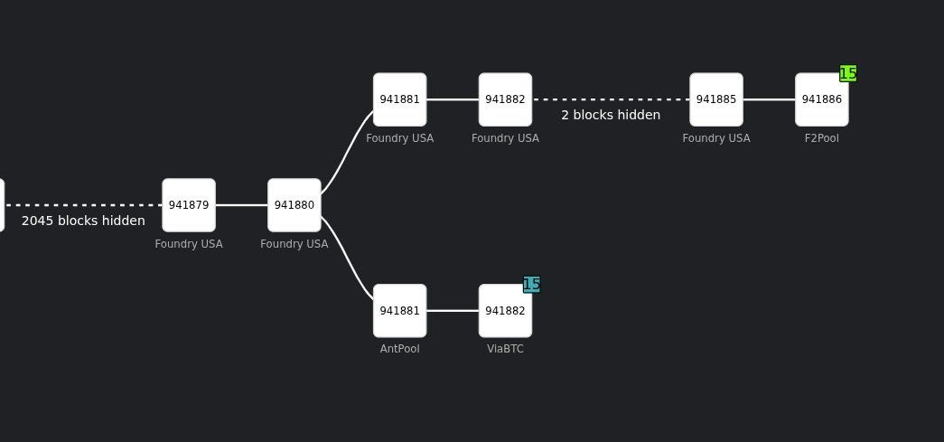 До 941 881 блока Foundry, крупнейший пул для майнинга биткоина, уже добыл четыре блока подряд. При практически одновременной добыче блока с AntPool, алгоритм отдал предпочтение цепочке с наибольшим совокупным доказательством выполнения работы — Foundry. В общей сложности на этот пул пришлось семь последовательных блоков: с 941879 по 941885.