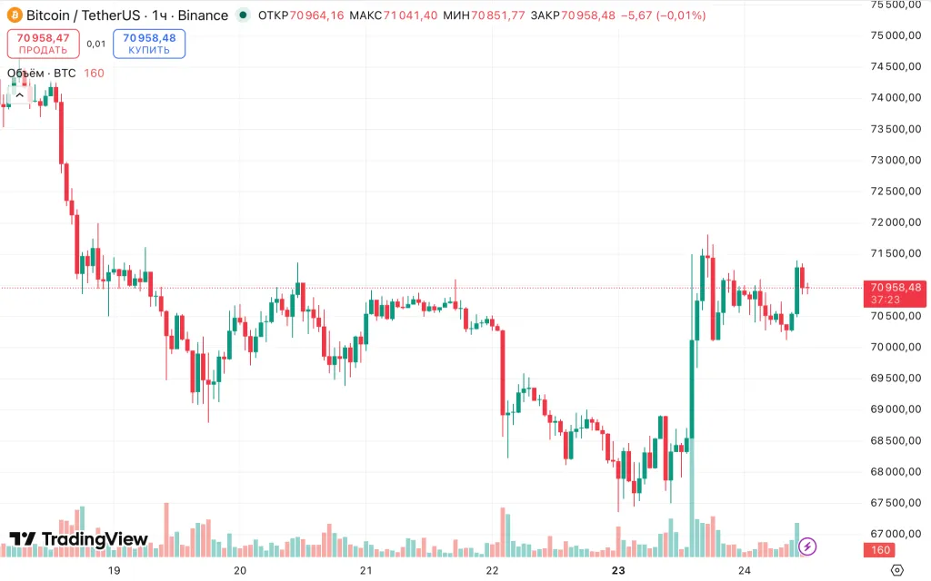 На момент написания биткоин торгуется около $71 000. За последние сутки цена актива выросла на 3,9%.
