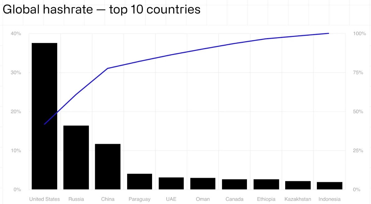 США остаются лидером с долей 38% от общемирового показателя. Россия занимает второе место с 17%, замыкает тройку Китай, на долю которого приходится 12% мирового хешрейта.