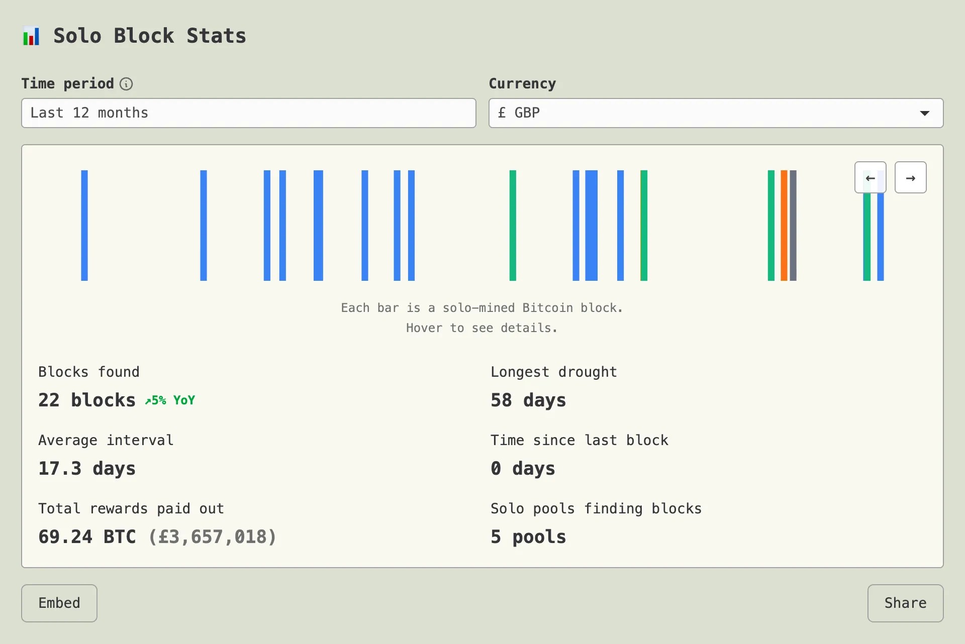 По данным Bennet, за последний год майнеры-одиночки нашли всего 22 блока, заработав 69,24 $BTC.