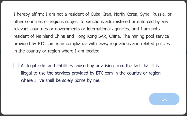 «Ваш регион не поддерживает сервис BTC.com. Если вы находитесь, или ваша компания была создана/зарегистрирована в материковом Китае или России, а также если вы являетесь гражданином/резидентом этих стран, вам запрещен доступ к нашим услугам».