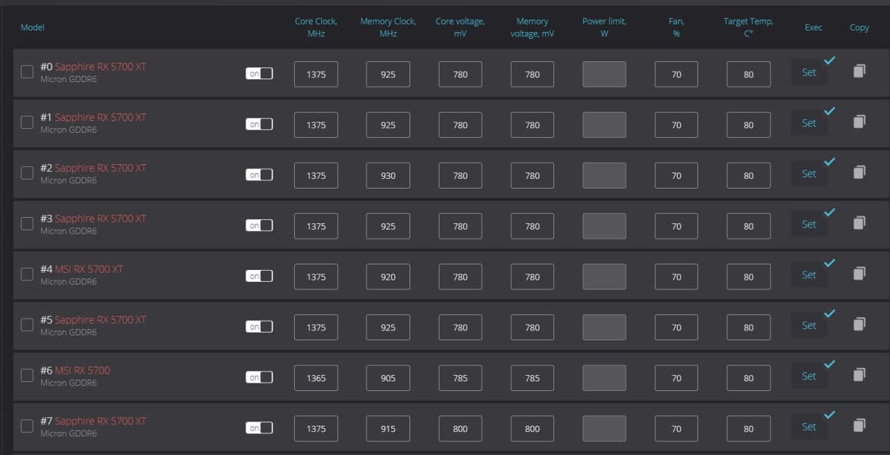 В отношении AMD RX 5700: ядро можно ставить 1300-1325-1350-1375, по памяти от 930 и понижаем по 5. Если не стабильно работают — тогда вплоть до 900. Вольтаж по 780.