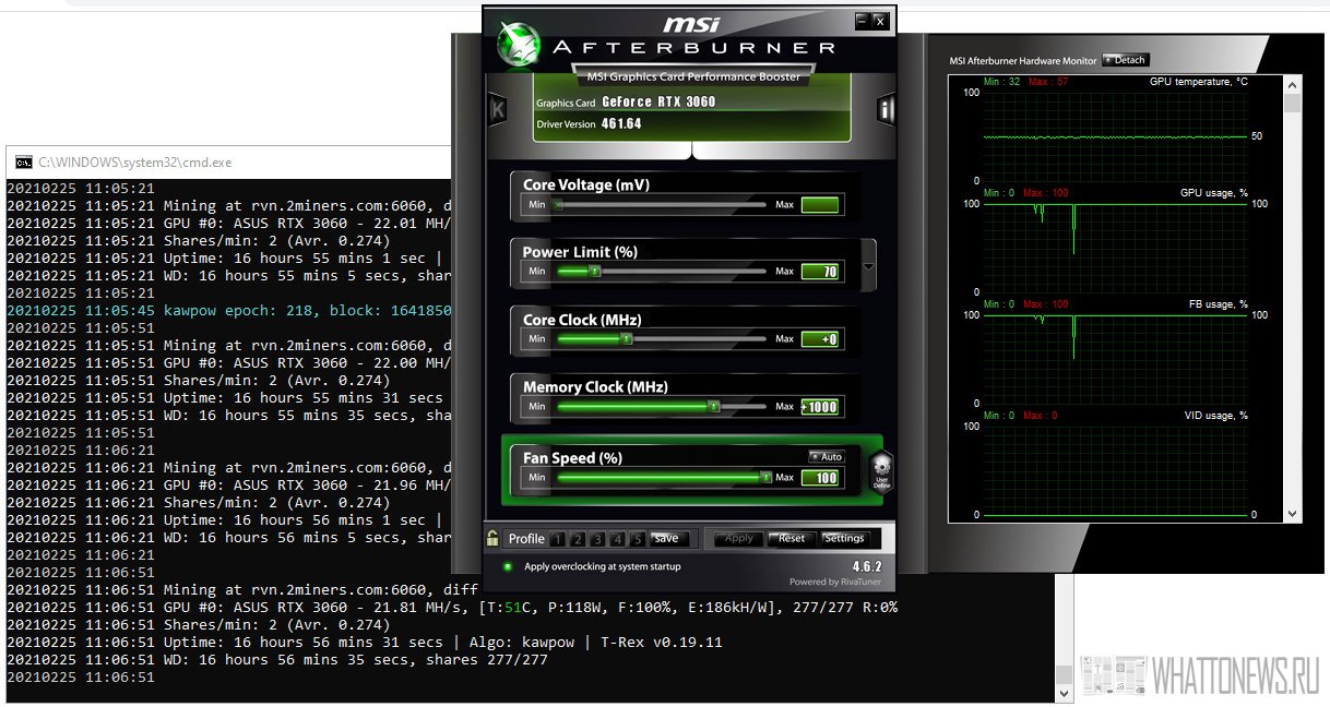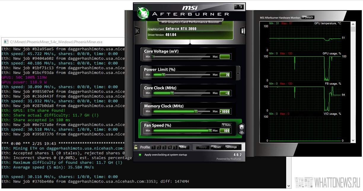 Когда мы запускаем Phoenixminer на графическом процессоре ASUS RTX 3060 с 70% TDP и +1000 МГц видеопамяти в MSI Afterburner, получаем почти 46 MH/s хешрейта для Ethereum, однако защитный механизм быстро срабатывает и хешрейт падает примерно до 23-24 MH/s. Майнинг Ethereum с 46 MH/s при энергопотреблении всего около 120 Вт — это вероятно, влажная мечта любого майнера. Однако, к сожалению, этого не произойдет. По крайней мере на данный момент. И это влияет не только на майнинг Ethereum, Ethereum Classic также получает половинное снижение хэшрейта. Даже алгоритм Vertcoin VertHash и возможно другие алгоритмы с интенсивной памятью.