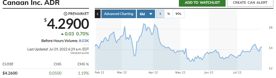 На момент написания акции Canaan все еще торгуются на Nasdaq. Премаркет оценивает бумаги в $4,29.