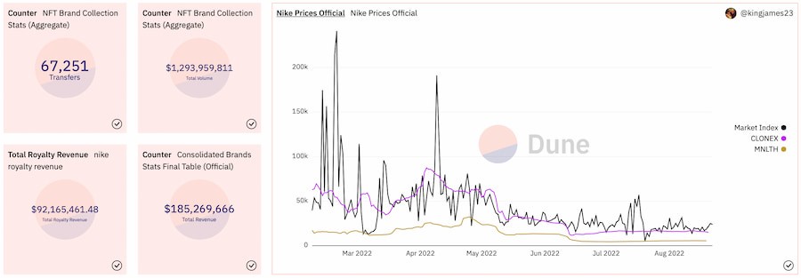 Панель инструментов IRL Brand NFT показывает, нам насколько прибыльными стали NFT для крупнейших мировых брендов. Отметим, что, несмотря на выручку, цены на NFT Nike упали, зафиксировав пик в феврале и апреле 2022 года.