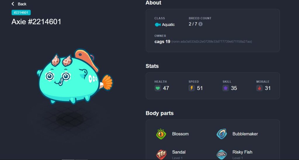 У каждого Акси свои особенные характеристики, которые отличают его от других существ. Например, зверьков различают по количеству частей тела и цвету. Ознакомиться с характеристиками можно в карточках Акси на маркетплейсе Axie Infinity или в личном кабинете (в случае с уже купленными зверьками).