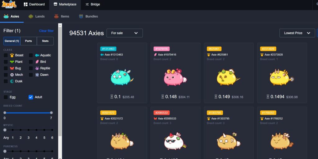 Приобрести Акси можно на маркетплейсе Axie Infinity. Зверьки продаются как уже взрослые, так и на стадии созревания (в яйце). Впоследствии они вырастут в полноценных Акси. От стадии яйца до появления особи проходит 5 дней.