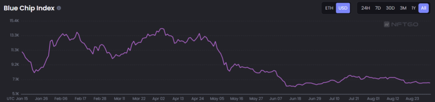 Например, индекс Blue Chip, который отслеживает показатели топовых NFT-коллекций, находится в нисходящем тренде с конца апреля.